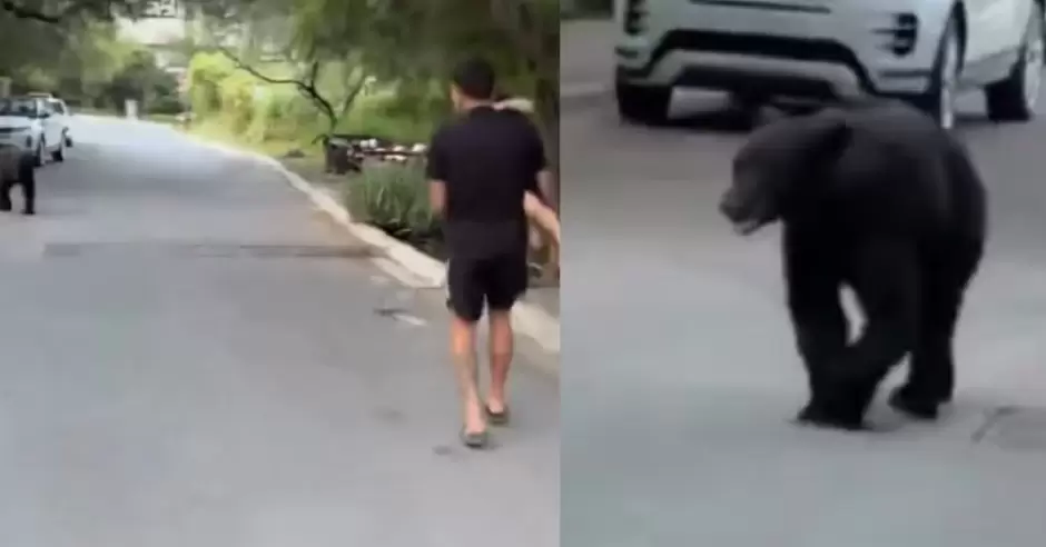 Mientras el oso caminaba hacia enfrente, el futbolista de Tigres trotaba para atrás evitando estar cerca del osezno.