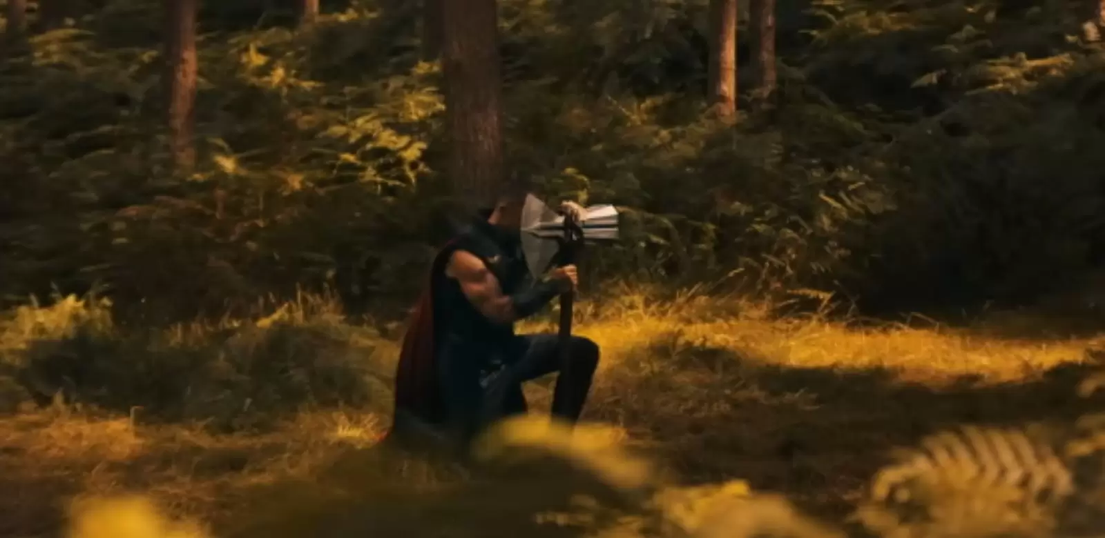 En lugar de grandes escenas de acción al inicio, el avance nos muestra a Thor arrodillado en un paisaje boscoso, levantando una plegaria hacia su difunto padre, Odín, en la que pide fuerza para poder regresar vivo y reunirse con su hija.