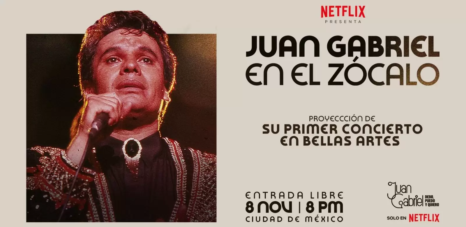 En redes sociales, Netflix confirmó que proyectarán en el Zócalo de la Ciudad de México el primer concierto de Juan Gabriel en Bellas Artes.