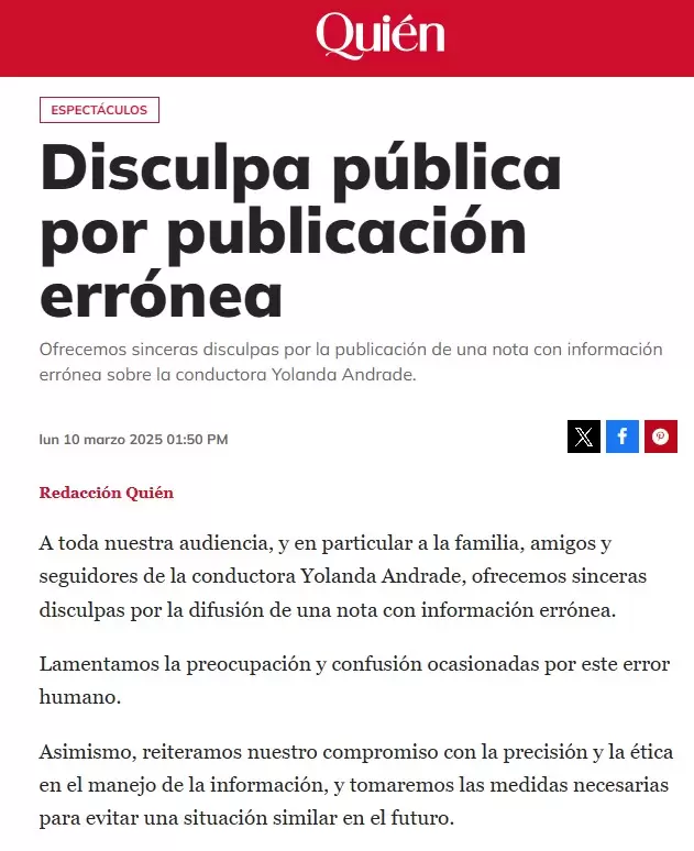 Luego de mal informar a sus lectores y preocupar a los fans de Yolanda Andrade, la Revista Quién compartió un comunicado ofreciendo una disculpa por su terrible error.