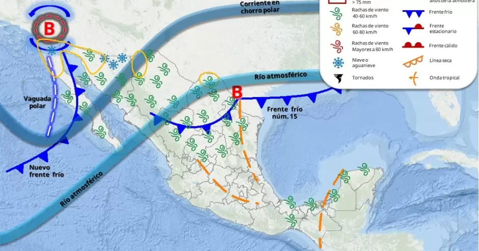 Finalmente, la masa de aire frío generaría un marcado descenso en las temperaturas y un ambiente frío a muy frío durante el fin de semana, con valores por debajo de los 0 °C en las zonas más elevadas de la Sierra Madre Occidental.