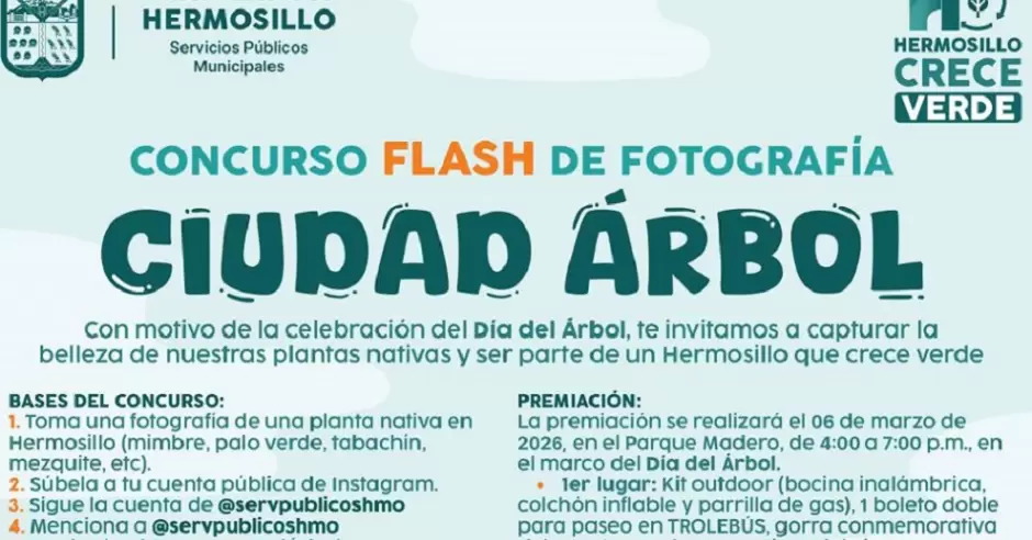 Entre las bases del concurso está tomar la fotografía de una planta nativa en Hermosillo como es el Mimbre, Palo Verde, Mezquite, entre otras; subirla a la cuenta personal pública en la red social Instagram, seguir la cuenta @servpublicoshmo de Servicios Públicos Municipales y mencionarlos, usar los hashtag #MesdelÁrbol y #HermosilloCRECEVerde.