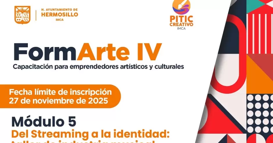 El Ayuntamiento de Hermosillo, a través del Instituto Municipal de Cultura y Arte convoca a artistas, integrantes de colectivos, gestores y promotores culturales a participar en el Módulo "Del streaming a la identidad: taller de industria musical", del programa FormArte IV, los días 27 y 28 de noviembre y 1 y 2 de diciembre.