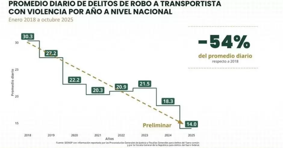 De acuerdo con datos del Secretariado Ejecutivo del Sistema Nacional de Seguridad Pública (SESNSP), en 2018 hubo un promedio diario de 30.3 robos a transportistas y para 2025, con corte al mes de octubre, se redujo más de la mitad con 14 casos diarios en promedio.