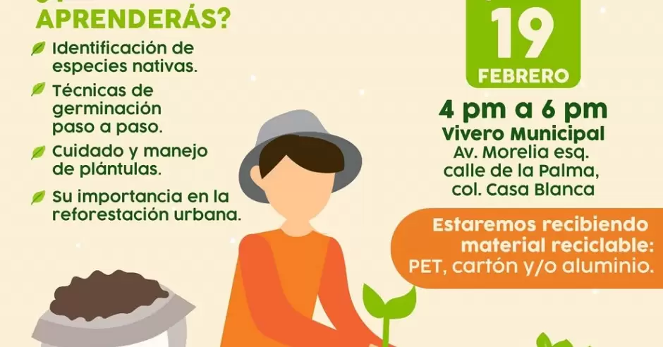 Entre los temas que aprenderán está identificación de especies nativas, técnicas de germinación paso a paso, cuidado y manejo de plántulas y su importancia en la reforestación urbana.