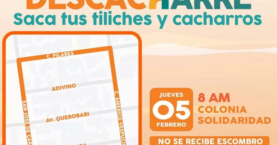 Con el objetivo de promover entornos más limpios y saludables, el Ayuntamiento de Hermosillo llevará a cabo una jornada de descacharre este jueves 5 de febrero en la colonia Solidaridad, por lo que se invita a las familias del sector a participar activamente en esta acción preventiva.