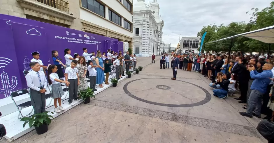 Afuera de Palacio Municipal se llevó a cabo la ceremonia de integración del Cabildo Infantil y del Consejo Infantil, encabezada por el alcalde Antonio Astiazarán Gutiérrez.