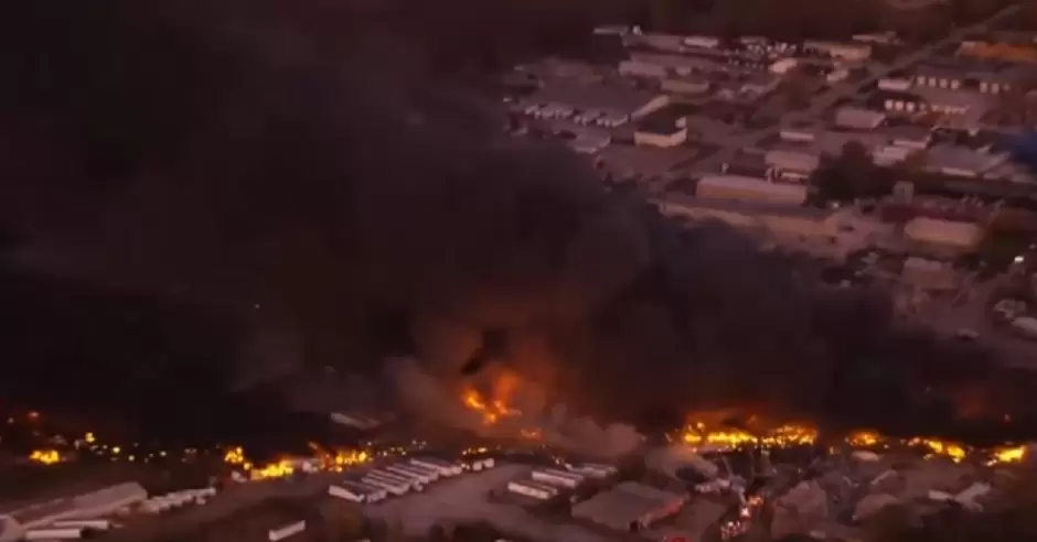 El incidente desencadenó una explosión masiva y un incendio que afectó a varios edificios cercanos, y una densa columna de humo negro se elevaba desde el lugar del accidente, al final de una pista de aterrizaje.