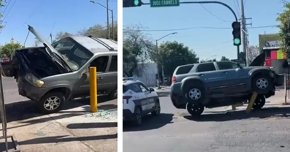 HERMOSILLO.- Un aparatoso choque registrado la mañana de este miércoles en la colonia Olivares, dejó a una persona con lesiones leves y daños de gran cuantía, ya que la unidad quedó montada sobre unos postes de contención propiedad del Ayuntamiento de Hermosillo.