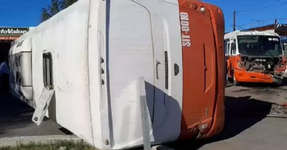 Uno de los choferes se habría pasado el semáforo en rojo en el cruce vial, lo que provocó el impacto entre ambas unidades, quedando una de ellas volcada sobre su costado derecho.