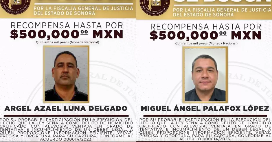 La noche del lunes 6 de octubre la Fiscalía de Sonora emitió las dos fichas de búsqueda por 500 mil pesos para cada uno de los implicados por su probable participación en la ejecución del hecho que la ley señala como delito de homicidio calificado con alevosía, ventaja en grado de tentativa e incumplimiento de un deber legal.