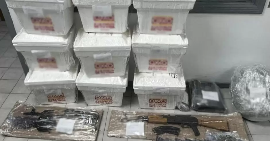 Durante la inspección localizaron 12 hieleras con paquetes que contenían 13 paquetes envueltos con cinta adhesiva, conteniendo hierba verde; además, aseguraron alrededor de 320 cartuchos y cargadores.