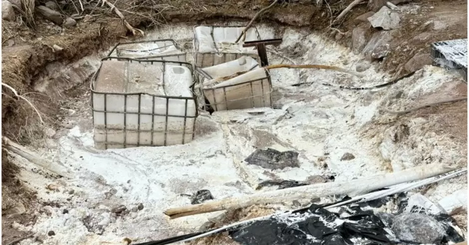 Además, 32 cajas de cartón con polvo blanco sin identificar, 492 tambos con capacidad de 200 litros, 481 bidones con capacidad de 20 litros, 108 tinas desconociendo su capacidad, dos tinacos con capacidad de cinco mil litros, entre otras sustancias.