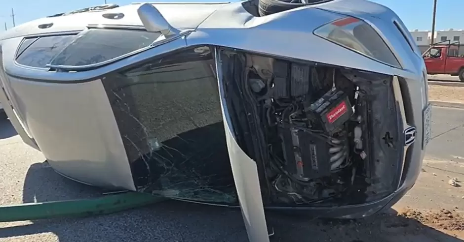 El golpe fue tan fuerte que el poste se desprendió de su base de concreto y terminó sobre el carril contrario, mientras el sedán volcaba y giraba 180 grados, quedando con el frente orientado hacia el Poniente.