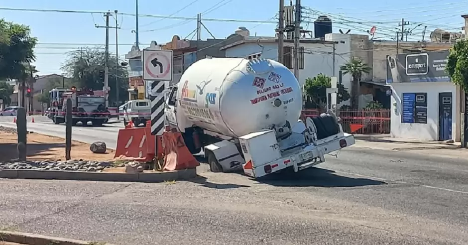 Una pipa con más de 10 mil litros de gas LP se hundió luego del colapso de un tramo de pavimento en la calle Olivares y Solidaridad, en la colonia Las Granjas, al poniente de Hermosillo, alrededor de la 1:00 de la tarde de este miércoles.