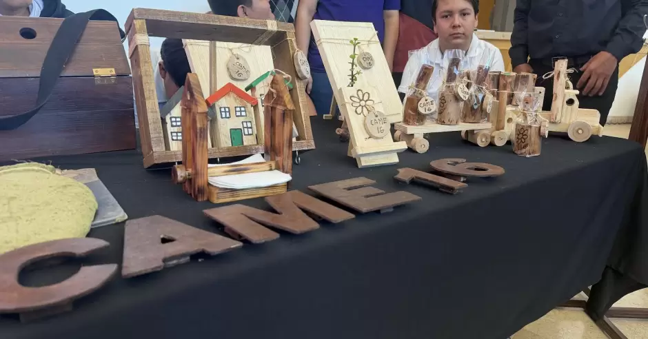 Entre los participantes destacó el CAM 16, cuyos estudiantes exhibieron artículos elaborados en madera, como chiltepineros, percheros y sacabotas, que producen dentro de sus talleres.
