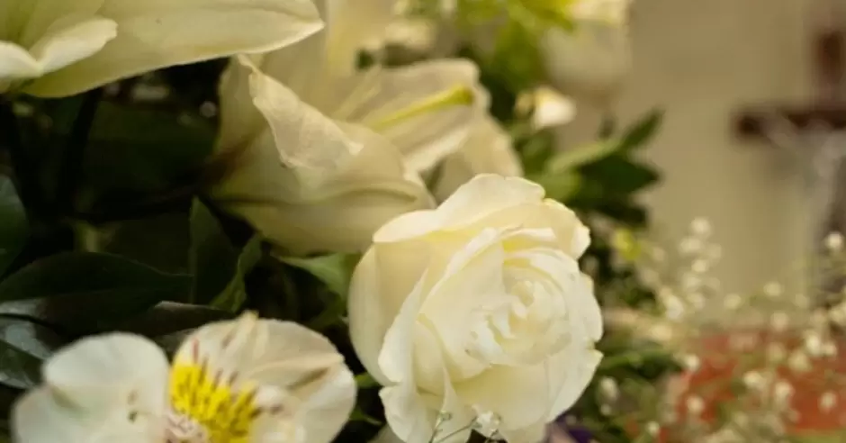 El féretro, de color claro y cerrado, estuvo acompañado por un arreglo floral con una banda con la leyenda "Padres e hijo", así como fotografías en las que se le observó rodeada de su familia.