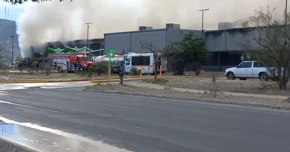 HERMOSILLO.- Un tramo de la pared de la tienda Sam's Club, sucursal Vado del Río, fue derrumbado con maquinaria pesada para que elementos del Cuerpo de Bomberos pudieran controlar el incendio que se presentó desde las 03:30 horas de este jueves, en Hermosillo.
