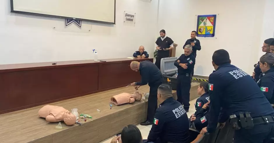 Hermosillo.- Para impulsar la profesionalización de los oficiales de la Policía Estatal de Seguridad Pública (PESP) y el servicio a la ciudadanía, la corporación recibió actualización por parte del personal paramédico en medicina prehospitalaria.