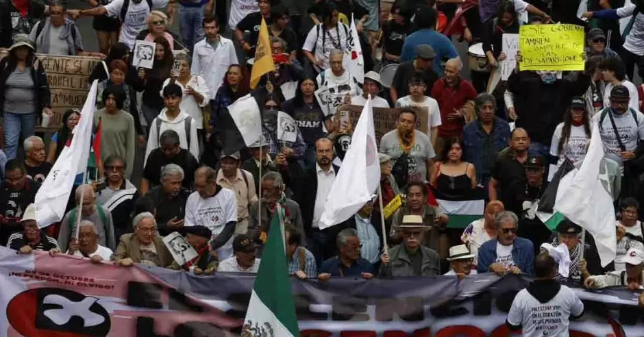 Durante el avance por Eje Central y la calle 5 de mayo, los grupos ondearon banderas de México, Palestina, de sus casas de estudios y carteles con consignas. También fichas de búsqueda de desaparecidos y los rostros de los 43 normalistas de Ayotzinapa a quienes Hernández Gamundi pidió integrar a la lucha.