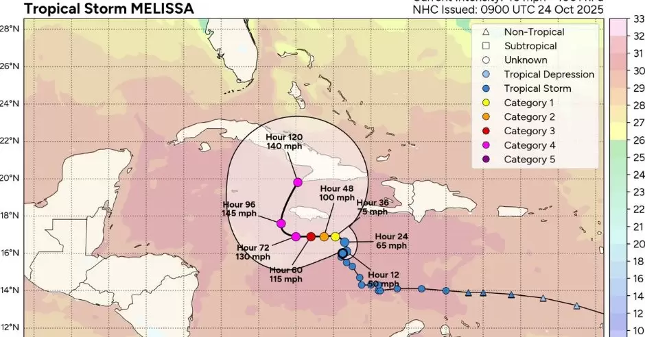 El pronóstico del NHC advirtió que, bajo condiciones muy favorables de temperatura oceánica y viento, "Melissa" podría alcanzar la categoría 3 o superior de huracán en las próximas 48 a 72 horas.