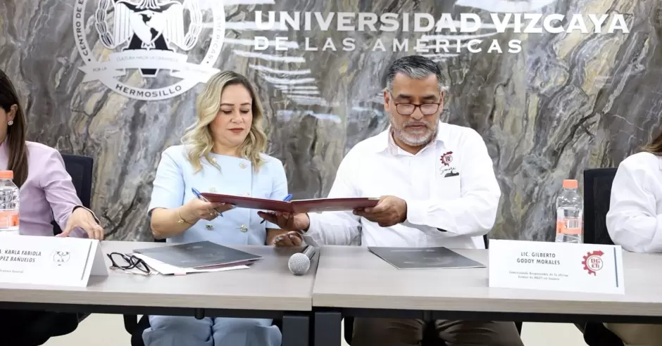 HERMOSILLO.- La directora general de la Universidad Vizcaya de las Américas campus Hermosillo, Karla Fabiola López Bañuelos, firmó un convenio con autoridades de la Dirección General de Educación Tecnológica Industrial y de Servicios (Dgeti) y los 15 directores de los planteles Cbtis en Sonora.