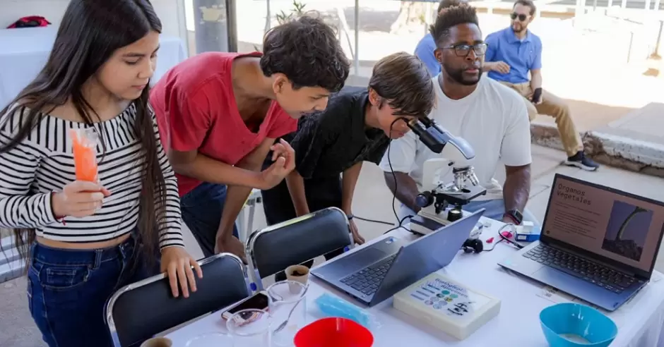 Acompañado por Daniel García Escalante, director de Participación Ciudadana, y Franco Villaescusa, director del Instituto Hermosillense de la Juventud (IHJ), Toño Astiazarán visitó el plantel ubicado en la colonia San Luis, donde se desarrollaron actividades infantiles en coordinación con DIMEX, enfocadas en cursos de ciencia y tecnología.