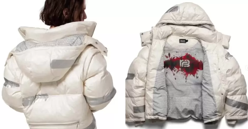 En el interior del forro, la prenda incluía una gran mancha roja que simulaba sangre, un detalle que intensificó la indignación.